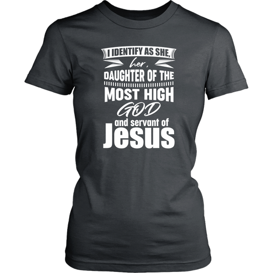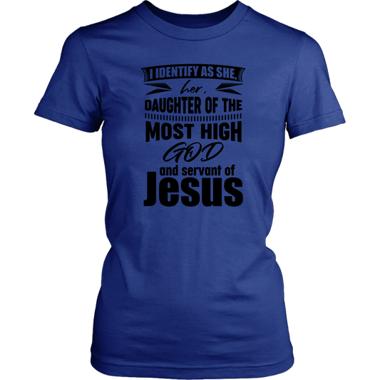 I Identify As She, Her, Daughter of the Most High God And Servant of Jesus Women's T-Shirt Part 1